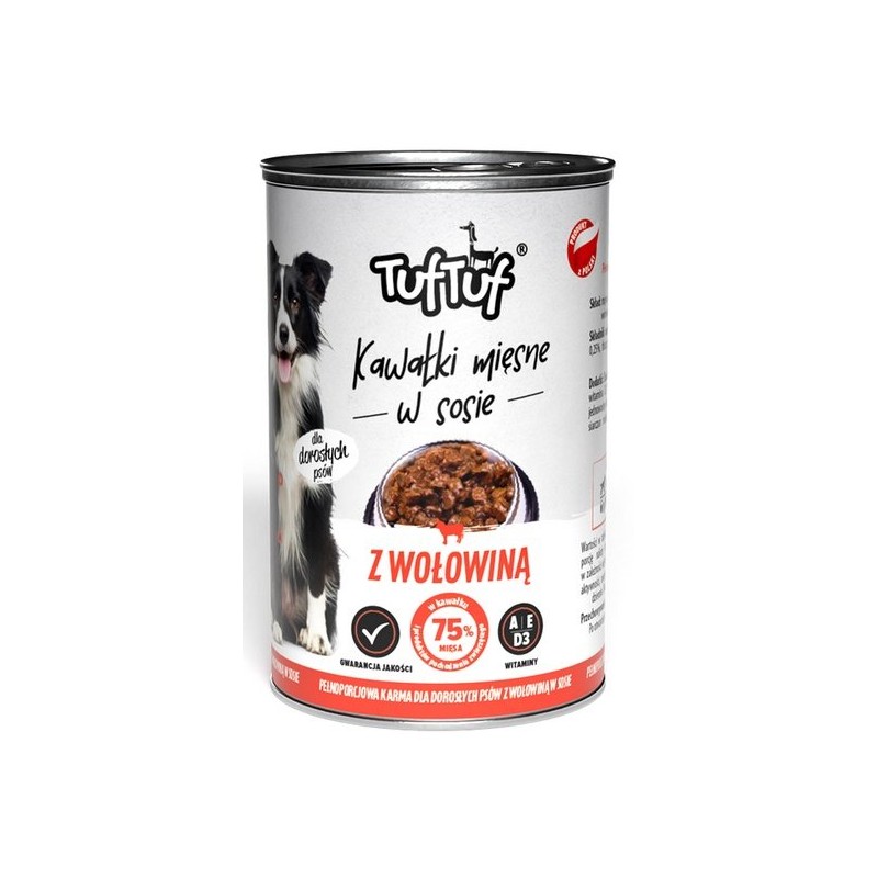 Mėsosgabalėliai padaže su jautiena "Tuf Tuf" - puikus pasirinkimas jūsų šuniui, mėgstančiam sultingos mėsos skonį ir aromatą. Šis visavertis ėdalas ne tik suteikia gardų skonį, bet ir daug naudos jūsų augintinio sveikatai.