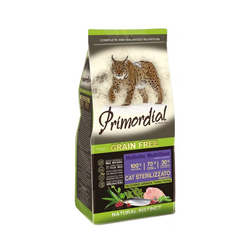 Primordial Grain-Free Adult Sterilised Turkey & Herring yra visavertis ėdalas sterilizuotoms katėms be grūdų.