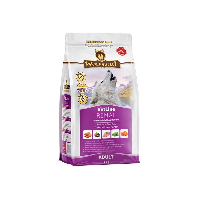 WOLFSBLUT VetLine RENAL yra dietinis visavertis pašaras suaugusiems šunims, skirtas palaikyti inkstų funkciją esant lėtiniam inkstų nepakankamumui ir sumažinti oksalatinių akmenų susidarymą.