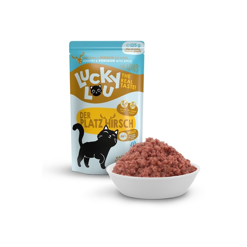 Gdzie indziej jest nudne standardowe jedzenie - Lucky Lou jest dostępne w 18 różnych odmianach smakowych w saszetkach 125 g oraz w puszkach 200 g i 400 g. Karma produkowana w Niemczech.