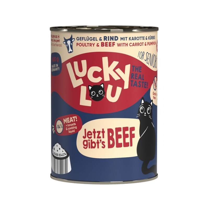 Gdzie indziej jest nudne standardowe jedzenie - Lucky Lou jest dostępne w 18 różnych odmianach smakowych w saszetkach 125 g oraz w puszkach 200 g i 400 g. Karma produkowana w Niemczech.