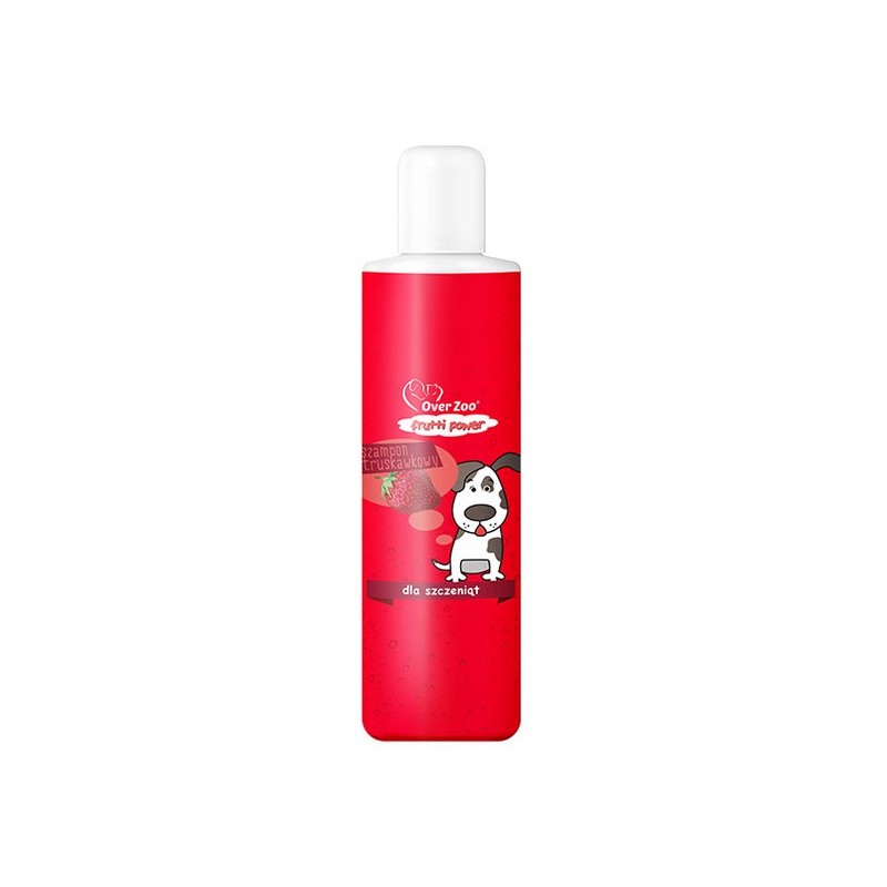 Owocowy szampon dla szczeniąt o zapachu truskawkowym.