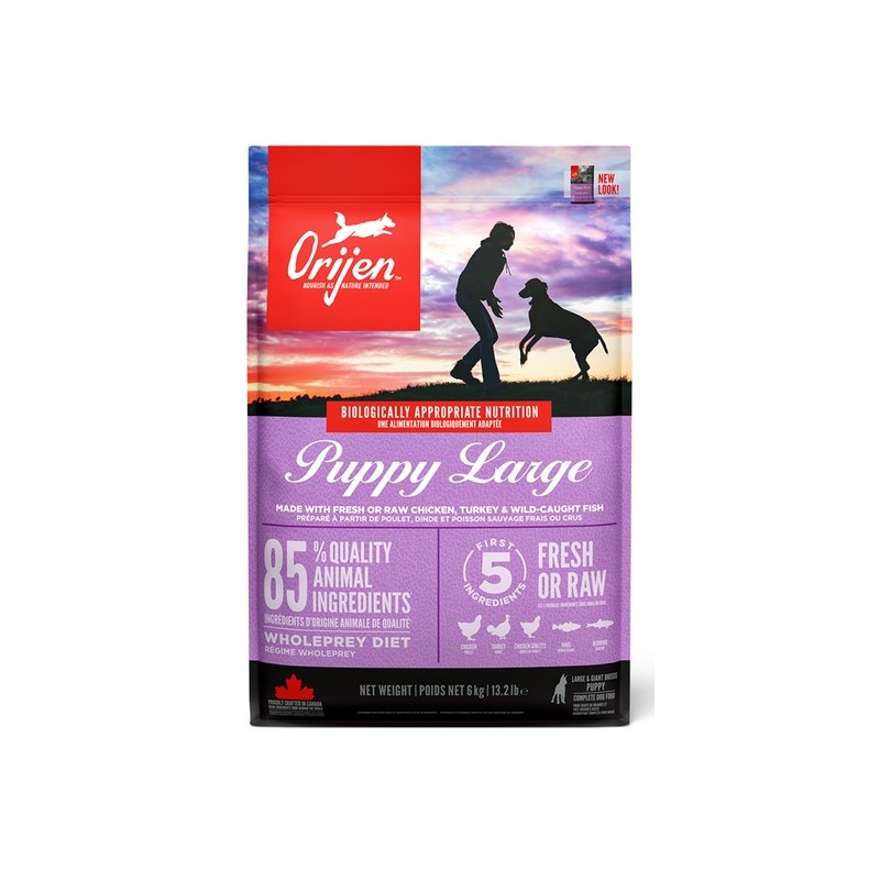 Właśnie dlatego nasze nagradzane jedzenie ORIJEN Puppy Large bogate w świeże mięso w Biologicznie Odpowiedniej proporcji WholePrey zapewni Twojemu szczenięciu optymalny wzrost i rozwój.