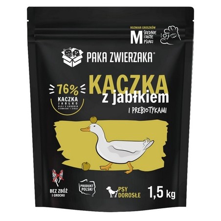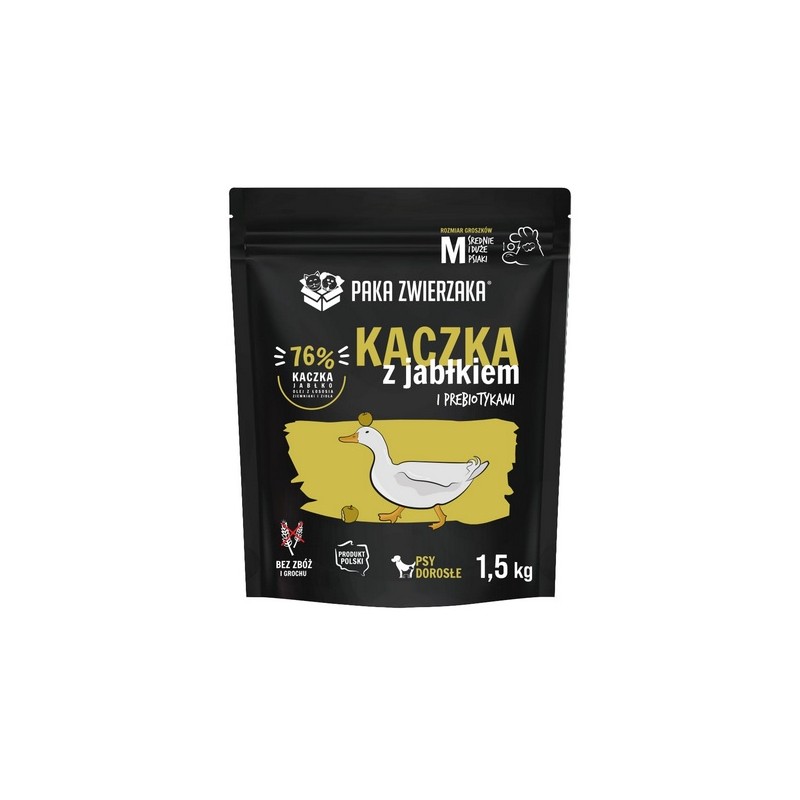 Doskonale zbilansowana karma sucha jakości SUPERPREMIUM pozbawiona zbóż, grochu, kukurydzy, soi, konserwantów i sztucznych barwników. Najwyższej jakości mięso kaczki, jabłek, warzyw i ziół pozyskiwane od lokalnych dostawców zapewnią wysoką smakowitość i łatwą przyswajalność. Idealna formuła dla psów z delikatnym żołądkiem i nietolerancją na zboża.