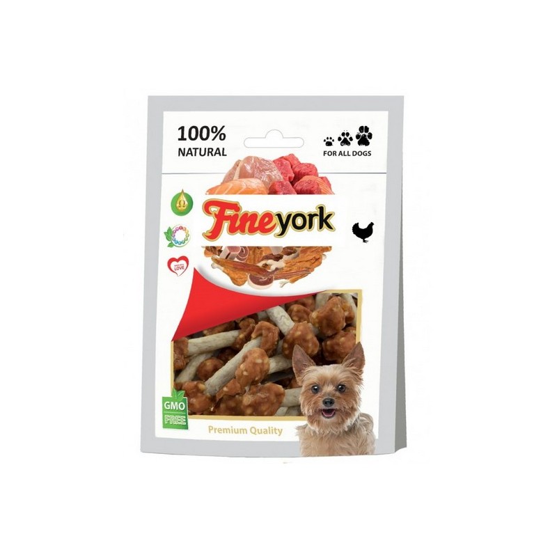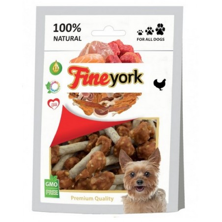 Fineyork Bone Snack to chrupiący przysmak dla psa w postaci smakowitego hantelka z najwyższej jakości mięsa drobiowego owiniętego wokół pałeczki z naturalnej skóry, który zagwarantuje pupilowi wielką przyjemność z gryzienia i żucia.