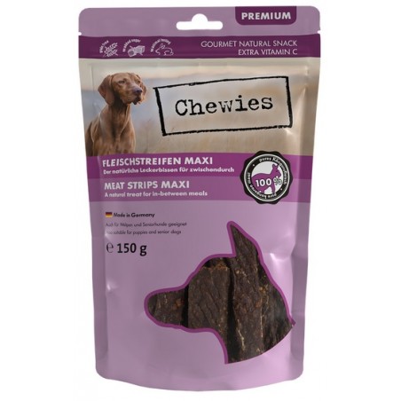 Chewies Meat/Fish Strips Maxi są tworzone z mielonego i delikatnie suszonego na powietrzu mięsa z dodatkiem witaminy C. Dzięki specjalnej produkcji wysokiej jakości składniki odżywcze mięsa są prawie całkowicie zachowane. Paski mięsne/rybne do żucia to smaczny i zdrowy przysmak między posiłkami. Są wyprodukowane w Niemczech. Paski Chewies Meat/Fish Strips Maxi mają przybliżoną długość 10 cm i od 2 do 3 cm szerokości. Można je także łatwo podzielić.
