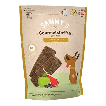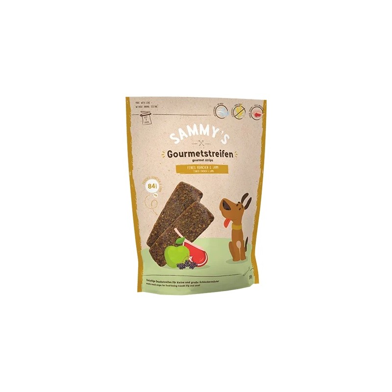 Czysta przyjemność - bezzbożowe paski dla smakoszy Sammy's ze świeżego kurczaka i delikatnej jagnięciny ze zdrową mieszanką chrupiących jabłek i owocowego czarnego bzu to absolutne przeżycie dla smakoszy dla Twojego czworonożnego ulubieńca.